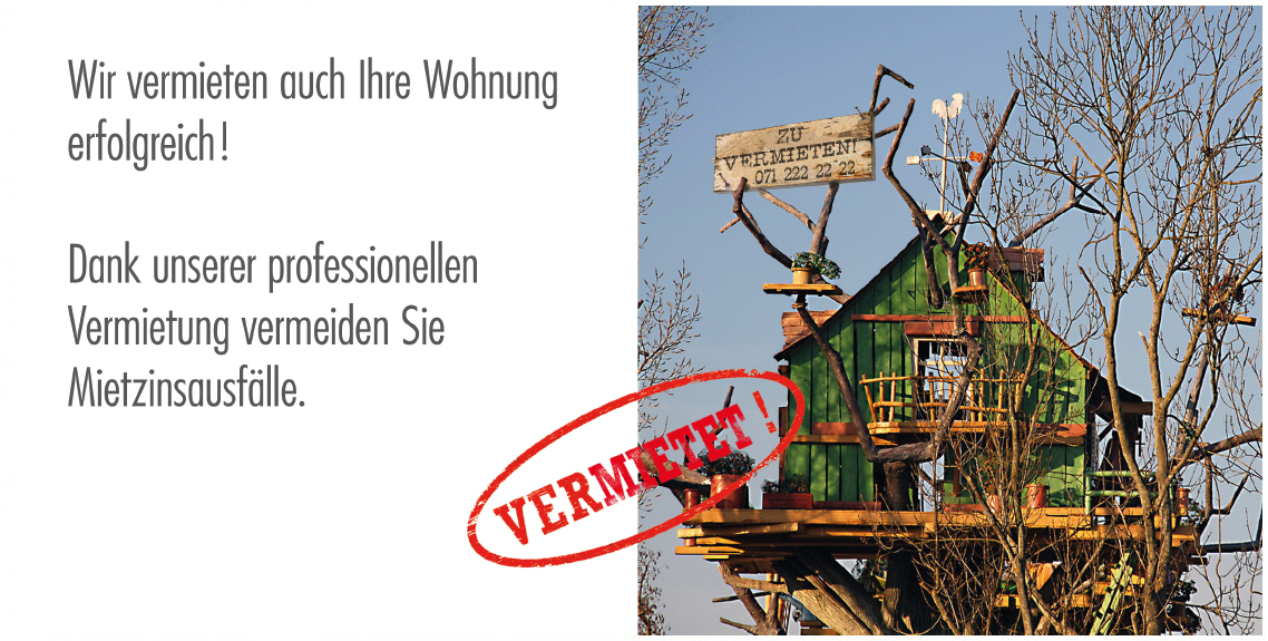 Wir handeln in Ihrem Auftrag und übernehmen für Sie aktiv die Vermietung Ihrer Wohnung oder Ihres Hauses. Dabei beraten wir Sie eingehend und konzipieren gemeinsam mit Ihnen eine marktgerechte, aber auch auf Ihre Bedürfnisse abgestimmte Vemietungsbasis. Die Realisierung erfolgt durch eine professionelle Vermarktung Ihres Objektes mit entsprechendem Insertionskonzept, Präsentation mit Bildern auf verschiedenen Internet-Plattformen sowie in unseren Schaukästen. Durch unsere stetige Marktpräsenz und somit täglich neuen Kundenkontakten, verfügen wir über ein grosses Netzwerk und einen breiten Kundenstamm an Mietinteressenten. Aber auch durch unsere langjährigen intensiven Berufserfahrungen schaffen wir eine optimale Voraussetzung, Ihnen empfehlenswerte Mietinteressenten zu vermitteln.